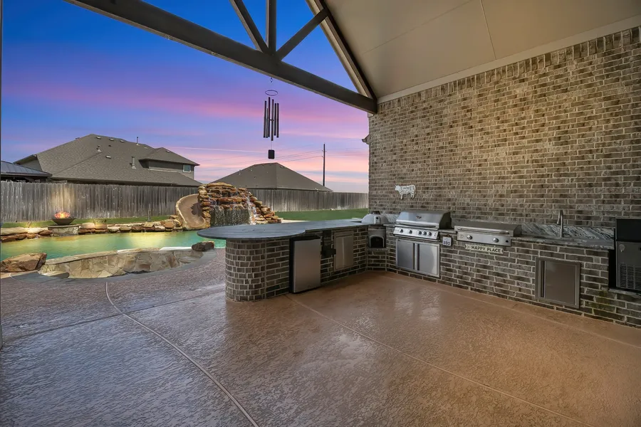 Dream Home like no other! Meticulously designed One Story Home complete with Tropical Outdoor Oasis: Custom Summer Kitchen, Beach Entry Swimming Pool, Rock Grotto, Waterfalls, Fire Bowls, Swim Up Bar, Slide, Hot Tub, Sunken Firepit w/Surround Seating, 300sqft Cov'd Patio w/ 19' Vaulted Ceiling, plus Yard Space. Set on magnificent 14,200sqft lot in coveted Katy Lakes. Stunning Brick & Stone elevation, Cov’d Porch, High Ceilings, Oversized 3.5 Car Garage. Opulent Kitchen w/towering Cabinetry, Massive Island, Stainless Appl, Dble Ovens and Breakfast Bar that opens to Dining Rm & Family Room w/ Cozy Fireplace and Wall of Windows that Welcome Soft Natural Light & Panoramic Views. Refreshing Owners Retreat w/room for King-size furnishings boasts Spa Shower w/Dual Heads & Bench, Dual Sinks & Massive Walk-In Closet. Gracious Secondary Bedrooms all w/Lg Closets. Flex Room can be Game Rm/Media Rm/Study. Generac Generator, Reverse Osmosis, Solar Panels Included! Highly Acclaimed Katy ISD Schools.