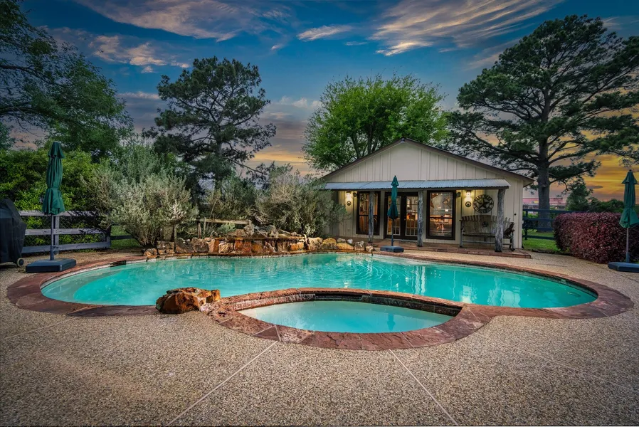 Tomball ISD property with a backyard oasis including a pool, spa, pool house, large covered back porch and fire pit. 740 sqft (per appraisal) party pool house was added in 2000 featuring central AC and heat, built-in bar, and a half bath. Pool has a water feature that evolves into a beautiful rock waterfall. Located on 1.3+ acres where horses, FFA projects and chickens are allowed. One story home has entry with mulit-sized tile flooring which is throughout much of the home. Cathedral ceiling in the living space featuring a real brick fireplace. Open floor plan from the living, dining, into the kitchen. Granite counters, pool views, double ovens and room for a second fridge nearby. Large game room, study or 4th bedroom. Recent paint, AC, duct work, pipes, dishwasher, roof, water heater and carpet. Large primary with 2 vanity areas, 2 closets and updated shower. Second full bath also has b...
