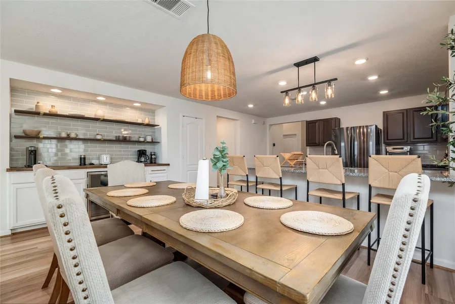 Charming One-Story with Stylish Upgrades! This beautifully designed home combines brick and stone for a welcoming exterior. Inside, you'll find a light and airy atmosphere with high ceilings and an open-concept layout perfect for both everyday living and entertaining. The spacious kitchen is a true centerpiece, featuring a large breakfast bar, a convenient coffee bar, and plenty of counter space. With 3 bedrooms plus a versatile flex room, there's room for everyone to live and work comfortably. The primary suite is a true retreat with ample space and natural light. Enjoy two full bathrooms, thoughtfully designed for comfort and convenience. Step outside to a covered patio ideal for relaxing. This home makes you feel at home immediately. Schedule your tour now before it is gone! This home qualifies for an FHA assumable loan at a 4.5% interest rate.