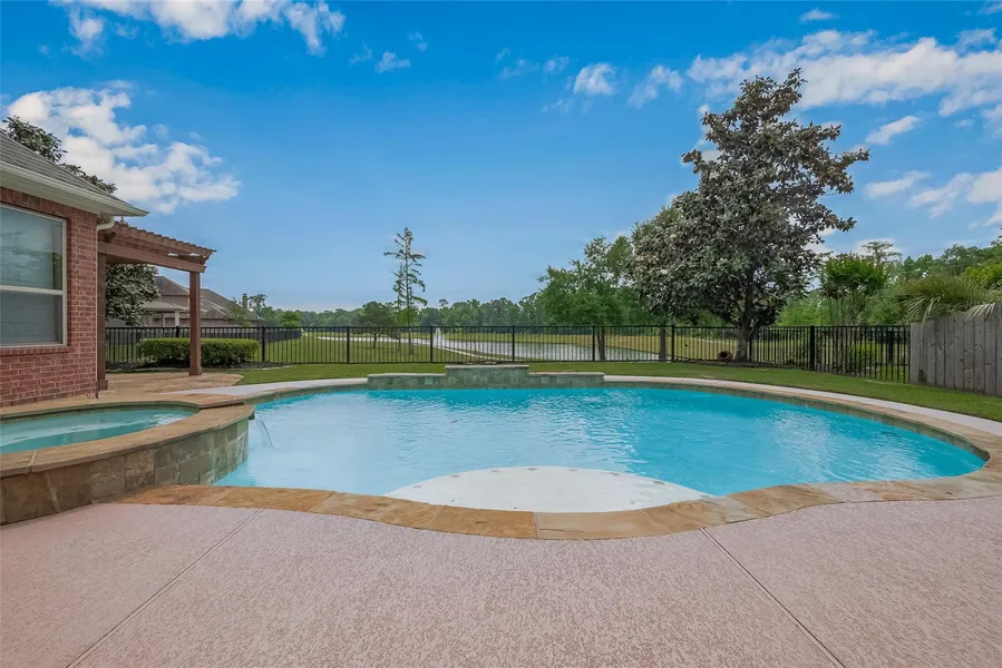 Elegant One & Half Story Home in Prestigious Gated Community with Sparkling Pool and Serene Waterfront Views. Private Courtyard at front of home is great for all of your plants & fountain. Your Gourmet Chef will love the Kitchen with gas cooktop, lots of counter space, drawers, cabinets and walk in pantry. The Primary Bedroom features spa like ensuite bath that includes two vanities with granite counter tops, relaxing jetted tub and oversized shower with seat. Primary Bedroom has an awesome view of lake & pool. Laundry room is thru the substantial primary closet and has sink, lots of cabinet & counter space & Washer & Dryer. Secondary Bedrooms are down with Jack 'n Jill bath. Game Room is up with half bath and balcony for picturesque view of lake & pool. Take a scenic hike on walking trails around lakes, pool & splash pad down the street. Easy access to I-45, restaurants & entertainment.