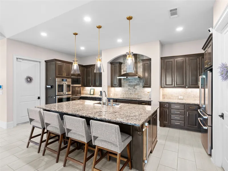 Welcome home! This upgraded 4-bedroom, 4.5-bath Caldwell home is one block from the private marina and 300-acre lake. A gated entrance leads to the front door, and casita—ideal for guests, in-laws, or a future pool house. The living room features soaring ceilings, a fireplace, and a large slider. The open-concept kitchen boasts GE Café French-door double ovens, a large cooktop, and a GE Café refrigerator. The spacious primary suite has a slider for natural light. The custom bath includes Kallista plumbing, a Kohler DTV+ system, an oversized hot tub, quartz waterfall counters, and an Elfa Shelf closet. Upstairs offers a wet bar, game room, bedroom, bath, and storage closet. A climate-controlled Texas basement provides easy storage access. Upgrades include Lutron automation, soft-close cabinets, a filtration system, and a Tesla Solar System with 3 Powerwalls. The exterior features a covered patio, outdoor kitchen, infrared grill, smoker, and $70K in landscaping.