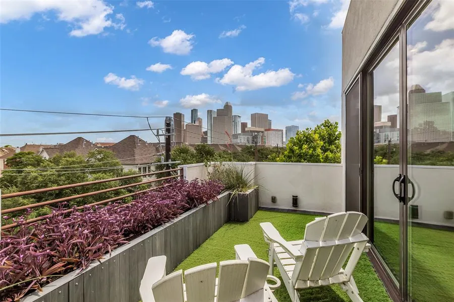 Double Lot!! Modern elegance in the heart of the city. This stunning home offers expansive outdoor living with a rooftop deck featuring unobstructed downtown views, a manicured oversized yard, outdoor kitchen, second-floor balcony, and a covered patio. Designed for comfort and flexibility, the spacious layout includes three bedrooms, a first-floor office, and a bonus room on the fourth floor with a full bath and it's own AC! The gourmet kitchen, equipped with premium Thermador stainless steel appliances, a six-burner gas stove, and ample counter and cabinet space, flows seamlessly into the dining and living areas-ideal for entertaining. A convenient powder room is located on the second floor. Additional highlights include a private driveway and a roomy two-car garage. Just a short walk to local parks, restaurants, bars, and public transit, with quick access to I-45, I-69, I-10, a bus stop just one block away, and the MetroRail within a 15-minute walk.