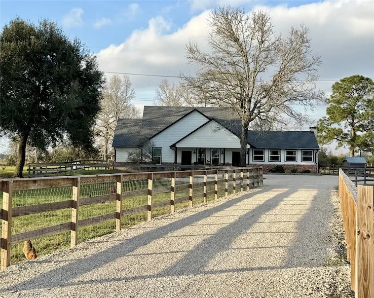 Time moves slowly here on Kennings Road. This fully fenced, unrestricted property dotted with native trees offers over 5 ag-exempt acres where chickens roam, cattle graze, and horses find shelter in a well-equipped stable. Cast a line into one of the two stocked ponds, or gather fresh herbs from the greenhouse to complement your evening meal. A fully modernized kitchen with quartz countertops, custom cabinetry, and an expanded walk-in pantry, all under soaring ceilings that fill the home with light. Afterward, unwind in the saltwater pool or soak in the hot tub beneath Texas stars. This home was fully renovated between 2023 2024 new roof, HVAC, plumbing, electrical, flooring, and finishes, top to bottom. A full-property Generac generator offers peace of mind, while the 1,000 sq ft barndominium welcomes you with two bedrooms, a bar, a kitchenette, and private access to a climate-controlled workshop. Just 30 minutes from Houston, this is the place.