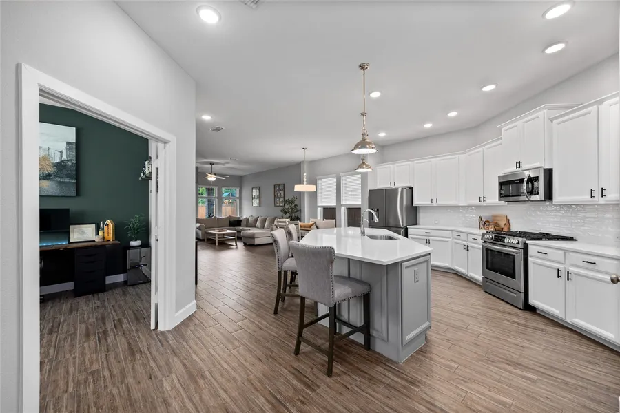 Welcome to this stunning two-story David Weekley home, beautifully maintained and move-in ready! The open-concept layout features soaring ceilings, abundant natural light, and elegant finishes throughout such as wood-look tile. The kitchen is a dream with white cabinets, quartz counters, stainless steel appliances, subway tile backsplash, and a spacious island perfect for entertaining. The private office with French doors offers a quiet place to work or study. The first-floor primary suite is a serene retreat with a luxurious ensuite bath and generous walk-in closet. Upstairs, you’ll find a spacious game room, two secondary bedrooms, and a full bath—ideal for family or guests. Step outside to the large covered patio, surrounded by beautiful greenery, creating the perfect space to relax or entertain. Zoned to top-rated schools and nestled in a welcoming community, this pristine home truly has it all!