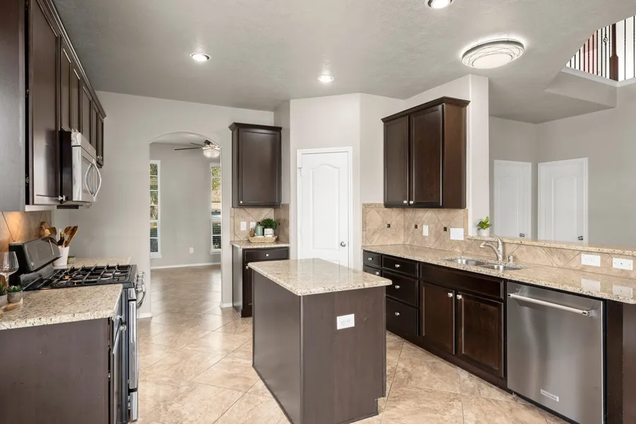 See VIDEO! Welcome - BEGIN THE SCHOOL YEAR IN THIS HOME - where space, style, and superb condition come together! Featuring an upstairs study that can easily flex as a 5th bedroom. An enlarged laundry room and added upstairs storage closet provide both function and extra square footage. Appreciate neutral paint tones, large tile flooring, ceiling fans in every room, and sunlit living spaces. An upstairs game room features custom built-in bookshelves, perfect for display/storage. Dream kitchen showcases KitchenAid appliances, rich espresso cabinetry, central island, and charming box seat window for extra light and seating. Garage offers options w/ tile floors and finished walls — ideal for a gym, man cave, or simply parking your cars in style. Corner lot and covered patio is ready for relaxing and entertaining - swing set stays! Curb appeal shines with a welcoming slate-tiled front porch,...