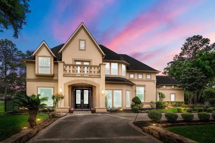 Elegant home on over an acre in sought-after Estates section of Gleannloch Farms, gorgeous landscaping with towering trees & circular driveway, beautiful stucco elevation, double leaded entry doors. 2-story foyer, spiral staircase, custom lighting, formal dining, hardwoods throughout. French doors to study with built-ins, den with wall of windows overlooking beautiful backyard, dual sided cast stone fireplace, huge open concept kitchen, large island featuring a 5-burner gas range, stainless steel appliances, beautiful cabinetry. Spacious primary room with bay windows, en-suite bathroom has whirlpool tub, walk-in shower with dual heads, dual vanities, custom mirrors. Upstairs gameroom; PLUS an amazing media room, 4 spacious bedrooms. Large outside covered patio with surround sound, outdoor kitchen, sparkling pool & spa with huge yard. Private gate with extra parking in the back. 3-car ove...