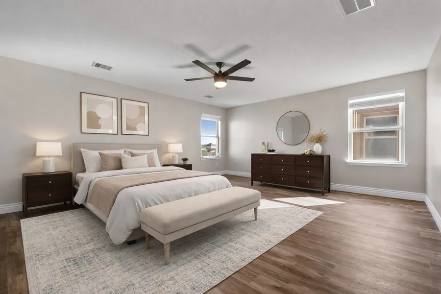 Welcome home to style, comfort, and smart living. This beautifully updated home features a 2023 kitchen renovation with quartz countertops, an elegant backsplash, and all Samsung appliances replaced in 2023. Ceiling fans have been added in every room and the covered patio for year-round comfort.