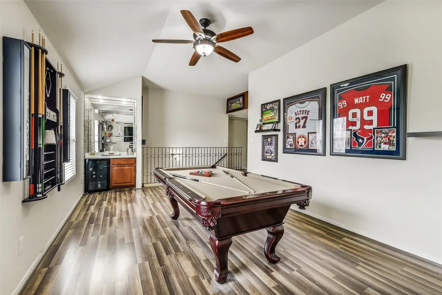 Inside, the kitchen showcases upgraded countertops, painted cabinetry, stainless steel appliances, a center island, a pantry enclosed by sliding doors, and a breakfast bar that overlooks the spacious family room. The first-floor primary suite is a serene retreat with a deluxe oversized walk-in shower with dual shower heads and a frameless glass enclosure. Upstairs includes a large gameroom with a built-in bar, 3 guest bedrooms, and a recently updated bathrrom. HVAC replaced 2 years ago. Zoned to Katy ISD and ideally located just minutes from schools, I10, the Energy Corridor, and much more. Don't miss this one!