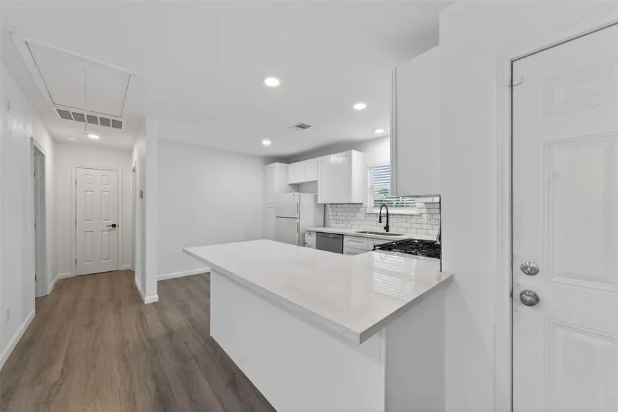 Renovated single-story home with 3 bedrooms, 2 full baths, and open floor plan for entertaining! Inside, you'll find wood laminate flooring throughout, neutral paint, all Quartz countertops, tiled bathrooms, ceiling fans, recessed lighting in the living area, a utility room in-house, and kitchen with updated stainless steel appliances, a breakfast bar, and subway tile backsplash. The primary bedroom suite is separate from the secondary rooms for added privacy and includes a walk-in closet and shower while the backyard offers plenty of space for outdoor entertaining! Conveniently located near the Texas Medical Center, Museum District, Hobby Airport, major highways, and more Downtown!