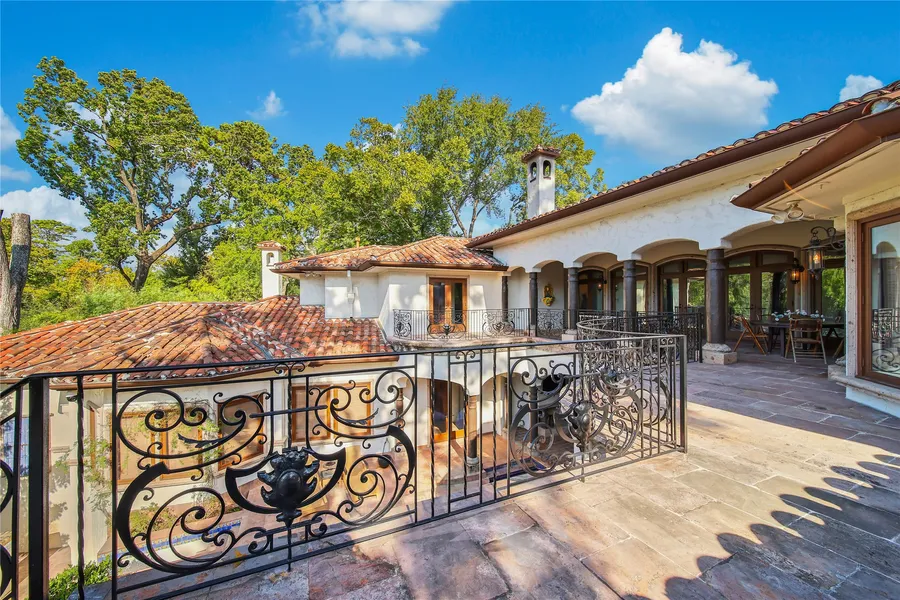 This 8,200 sq. ft. + Spanish Colonial estate, moments from the Galleria, is a masterpiece of symmetry and Old World elegance. The home centers on a magnificent U-shaped courtyard with artisan-tiled walkways overlooking a shimmering pool and seasonal creek. A grand foyer welcomes you with travertine floors featuring wood and granite inserts and a sweeping iron staircase. The chef’s kitchen, equipped with high-end appliances, serves both a formal dining room and a bright breakfast area. The 32x17’ primary wing is a true sanctuary, boasting soaring ceilings with antique beams, dual baths, and a private library, with a dedicated fitness gym located just above. The second level offers three generous bedrooms, while the outdoor living area provides a serene, private retreat. Complete with a three-car garage and an effortless commute, this estate offers the ultimate Houston lifestyle. Combining seclusion with urban access, it is the pinnacle of refined luxury and architectural detail.