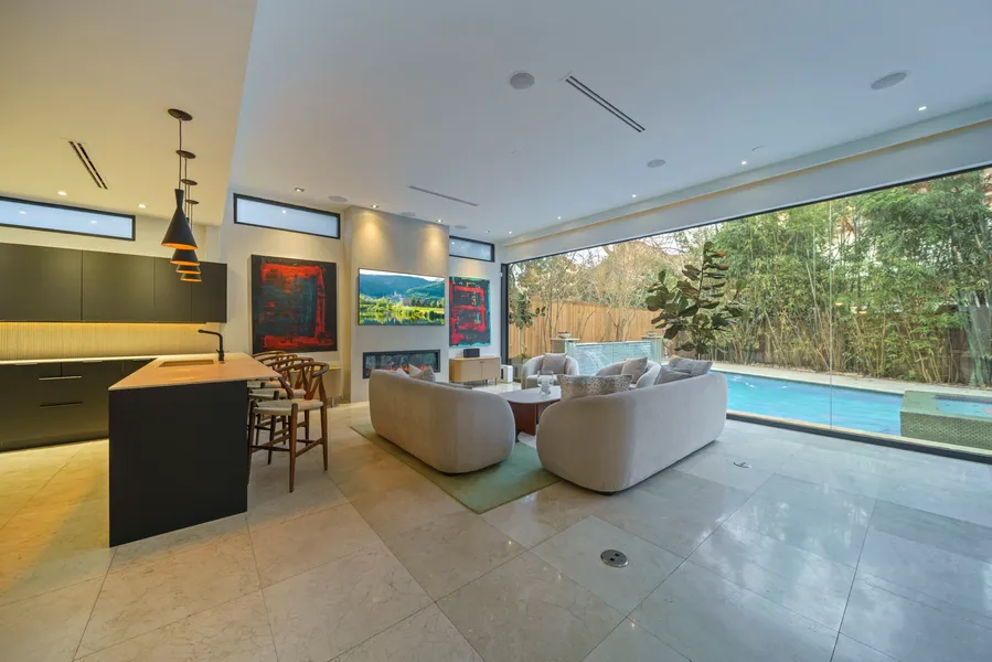 Modern luxury in the heart of Galleria/Uptown with NO HOA. This stunning contemporary home offers 4 oversized bedrooms, 4 full baths, and 2 half baths with high-end finishes throughout. First-floor living includes the primary suite, living and dining areas, wet bar, and chef’s kitchen. Floor-to-ceiling windows fill the home with natural light and showcase the private backyard oasis featuring a modern pool and spa, built-in BBQ, lounge areas, contemporary fire pit, and lush landscaping. Upstairs includes a billiards room with electric fireplace, private gym, and oversized theater with surround sound and fiber-optic star ceiling. Enjoy city views from the rooftop terrace with fire pit. Prime location on a quiet street with high end new construction located near Houston’s top dining, shopping, and nightlife.