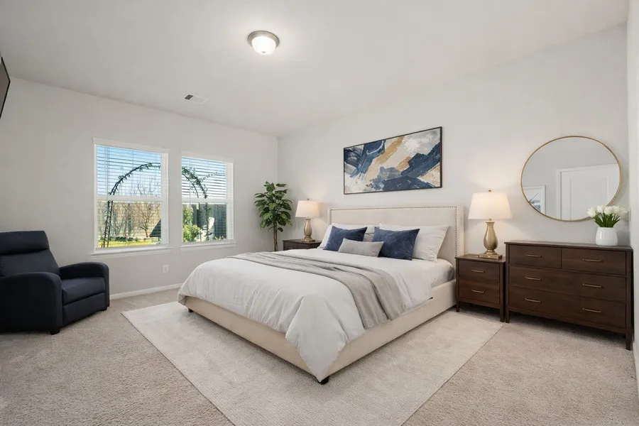 Welcome to this two-story home featuring 4 bedrooms, 2.5 baths, a flex front room that works as a home office or optional 5th bedroom (with closet) on the first floor, and an upstairs game room for added flexibility. The front entry opens to a bright family room with an open-to-below design, creating an airy feel with large windows. The kitchen flows into the main living space and offers ample cabinetry, neutral countertops, and a breakfast area—ideal for everyday living and entertaining. The primary suite is located on the first floor and includes a private bath and walk-in closet. Upstairs, a spacious game room connects to three secondary bedrooms and a full bath. Step outside to the covered sunroom, overlooking the well-maintained backyard, perfect for all outdoor activities. Conveniently located near I-69, TX-99, I-10, and Hwy 146, with easy access to shopping and dining. Community amenities include a scenic lake with fountains, walking trails, parks, and playgrounds.