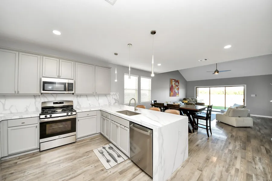 Welcome to your dream home in a great neighborhood offering top-tier amenities including a community pool, park, clubhouse, & scenic walking path! This beautifully maintained two-story home features an open-concept design w/ 5 spacious bedrooms, 2.5 bathrooms, & a desirable split floorplan for added privacy. NO BACK NEIGHBOR, Step into a beautiful kitchen equipped w/ a large porcelain waterfall island, stainless steel appliances, & abundant cabinetry—perfect for entertaining or everyday living. Soaring ceilings and tons of windows throughout the home give tons of natural light, Recent updates include luxury vinyl flooring, porcelain slab around fireplace with custom cedar beam mantel, Sliding glass door Leading you to your Dream backyard, new cover patio with pergola and OUTDOOR KITCHEN!! vermiculite tile flooring, making this home truly move-in ready. Don't miss your opportunity to ow...