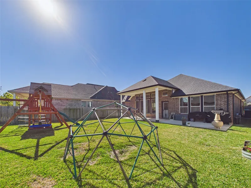 Welcome to this show-stopping one-story home in the sought-after Morgan’s Landing community of La Porte! Situated on an oversized lot with gorgeous landscaping and incredible curb appeal, this 3-bedroom, 2-bath home also features a versatile flex space perfect for a home office or 4th bedroom. Step inside to extra-tall ceilings, tile flooring throughout, and a light-filled great room with a cozy fireplace and a stunning wall of windows overlooking the expansive backyard. The kitchen is a true centerpiece with a huge island, beautiful backsplash, and abundant counter space. The custom primary closet adds a luxury touch, while the drop zone near the garage keeps life organized. Outside, enjoy a covered patio with extension, widened driveway, soffit lighting, sprinkler system, full gutters, and a generator-ready gas line. Security cameras already in place provide extra peace of mind! Morgan’s Landing offers a community pool, scenic walking trails, and a dog park. Zoned to La Porte ISD.
