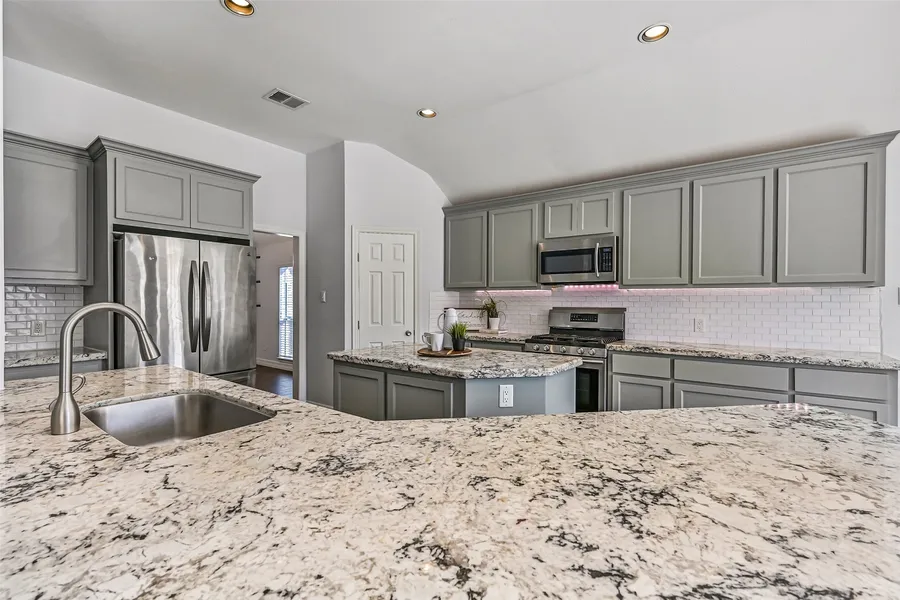 Spacious & highly sought-after single-story home offering 2,670 square feet of beauitfully updated open concept living in the desirable Autumn Creek community in Clear Creek ISD! This well-designed floorplan features fresh neutral paint, abundant natural light streaming in through double paned windows, as well as beautiful wood-look tile flooring extending throughout multiple living areas with a stunning stacked stone gas fireplace in the family room. The fabulously remodeled island kitchen is at the heart of the home and it boasts custom grey cabinetry, gorgeous granite countertops, a timeless subway tile backsplash, & stainless-steel appliances. A split floorplan ensures privacy for the 4 bedrooms with plush new carpet & generously sized walk-in closets, and 3 full baths provide maximum flexibility. Additional highlights include a rare three-car tandem garage & an efficient layout that...