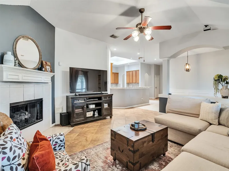 Welcome to your dream home in a sought-after golf course community, where luxury living meets comfort and functionality. The home’s exterior boasts a welcoming entry. The entryway leads into a well-lit and spacious formal dining and living area, featuring elevated ceilings and abundant natural light. At the heart of the home, you will find an open concept that connects the family, breakfast, and island kitchen. The kitchen has a skylight that provides all-natural lighting, large island with wine fridge, bar seating, stainless steel appliances, and plenty of cabinet space. Privately situated at the back of the house is the primary suite which includes a spacious bedroom, the primary bathroom featuring dual sinks, a soaking tub, a walk-in shower, along with his and her walk-in closets with all other bedrooms on the opposite side of the home. Home offers a huge covered back patio with an open bar area - perfect for hosting guests, relaxing evenings, or outdoor dining year-round.