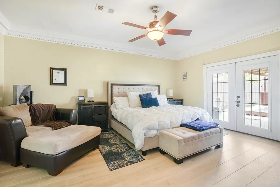 The primary suite is a true retreat with French doors leading to a spacious backyard with a custom patio and spa. The spa-like primary bath features an extended shower, floating sinks, and modern finishes. An additional flex room currently serves as a gym, while the 4th bedroom has been converted into a media room with a projector that conveys. Stylish staircase, upgraded hardware, and contemporary details complete this must-see home.
