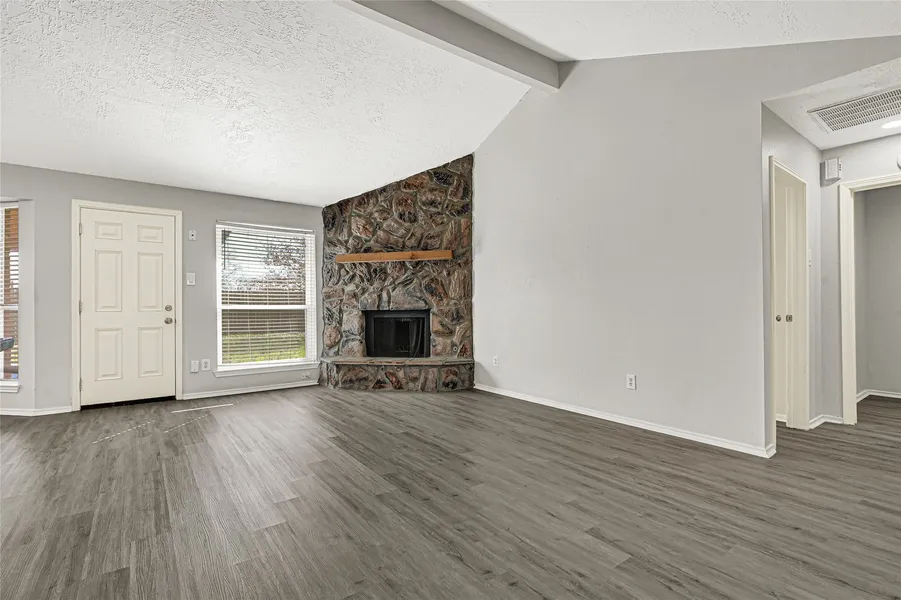 Updates throughout and plenty of space to gather! This upgraded two-bedroom, two-bathroom home features updated vinyl plank flooring, lighting, and a well-equipped kitchen. Enjoy granite countertops, Shaker-style cabinetry, brushed nickel fixtures, and a wine cooler. The spacious living area is complete with a stone fireplace and mantle. A breakfast area completes the space. Two ample-sized bedrooms plus a bonus room feature vinyl plank flooring and ceiling fans. The primary suite also features an en-suite bathroom with a walk-in shower, granite countertops, and dual undermount sinks. Outdoors, enjoy a covered deck area and an oversized fenced backyard with greenspace to the rear. Easy access to I-45, the Hardy Toll Road, IAH, and area conveniences.