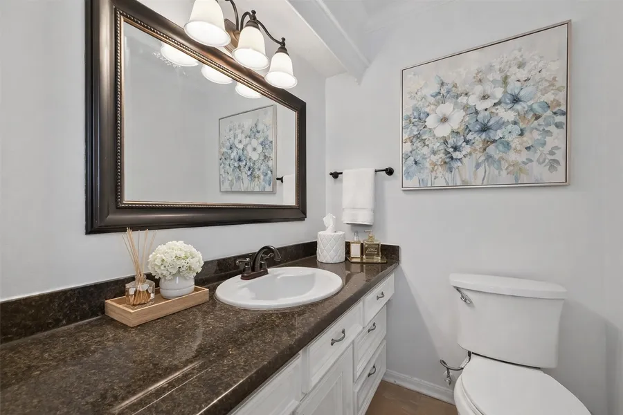 Nestled in the exclusive enclave of Champions Forest, this estate-style home sits on a wide lot surrounded by lush landscaping and features brand-new modern French front doors. Elegant marble tile, detailed millwork, and freshly painted wainscoting create timeless appeal, while cathedral ceilings, a grand staircase, and a classic brick fireplace anchor the main living spaces. Hardwood stairs and all-new wood flooring upstairs offer a bright, CARPET-FREE interior. The kitchen features dark granite countertops, white cabinetry, and stainless-steel appliances. A study with custom built-ins, a spacious primary suite with a five-piece bath, formal living and dining rooms, double staircases, and a 3-car garage with a convenient friends’ entrance complete the home. Recent updates include fresh interior paint, remodeled upstairs baths, new upstairs flooring, and new front doors. Some photos are virtually staged to illustrate furniture placement and design.