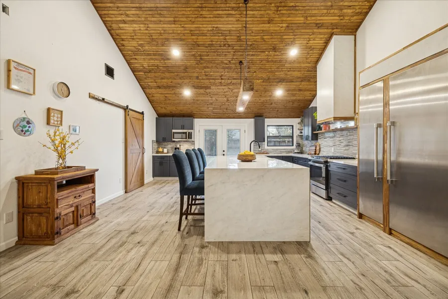 Stunning and Unique home, extensively renovated in April 2024, with high end finishes and luxury accents. 10' Waterfall Kitchen Island with Porcelain countertops and butcher block accents. Soaring ceiling in Family room with Open concept floor plan. Cathedral ceiling has tongue & groove ship lap in cedar, pus a Thermador refrigerator & freezer. All New in 2024 includes Roof, electrical, plumbing, electrical panel, HVAC, Water Heater, Ductwork, all stainless steel appliances, and completely new Kitchen. Sheetrock has been replaced including a large portion of studs & framework. Wood Look Tile flooring throughout, and home has a "New Home feel". Large patio in backyard , and a Stunning Porch was added in 2024. New driveway in December 2025. There's a bonus storage building in back corner of backyard that has electricity, and an AC unit, perfect for a work shop, She Shed, Man Cave, H...