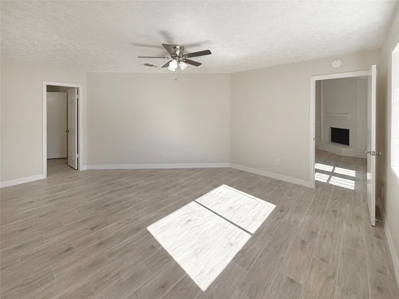 Welcome to this beautifully renovated 3-bed, 2-bath home in North Houston with a NEW ROOF, NEW AC, functional floor plan with the primary suite separate from the other beds, NO CARPET, NEW FLOORS and two patios. The living room, or the heart of the home, features vaulted ceilings, a stunning wood burning fireplace, crown molding, easy access to the dining and kitchen space and expansive windows overlooking the spacious backyard. The bright, renovated kitchen boasts new granite countertops, white cabinetry, plenty of counter space, view to the front of the home and new stainless steel appliances. Fresh paint, new fixtures, walk in closets and crown molding throughout. Primary suite privately located and features an oversized en-suite bath with a double vanity, white and bright tub/shower combo, and a large walk-in closet. Secondary bedrooms share a full bath on other side of home. Not in ...