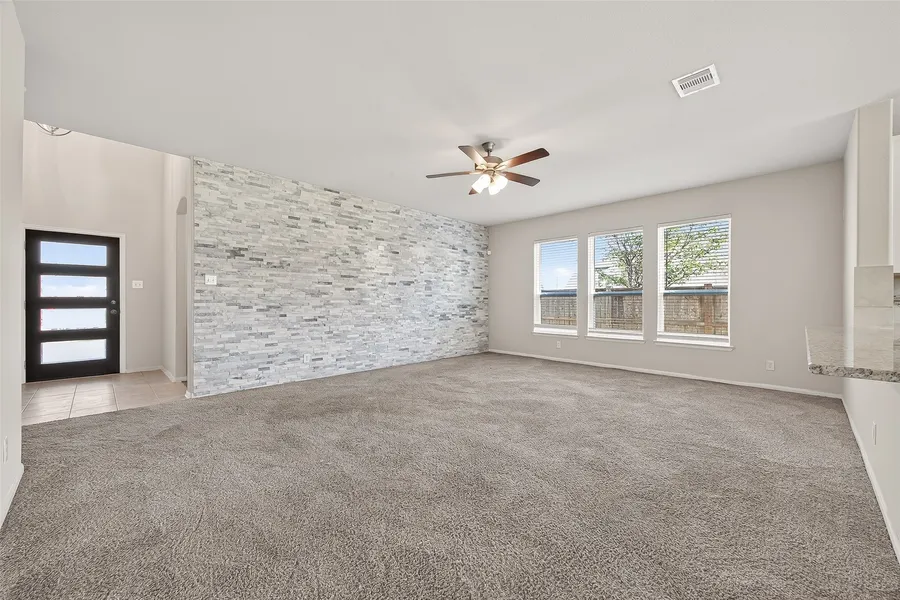 This 4-bedroom, 3-bath home features an open layout with spacious living areas and large windows that bring in natural light. The kitchen includes ample cabinetry, solid-surface counters, and an island that connects to the dining and living spaces. The first-floor primary suite offers a generous bedroom, walk-in closet, and bath with dual sinks, separate shower, and soaking tub. Secondary bedrooms are well-sized with closet storage and access to full baths. A flex space provides additional versatility for work or leisure. The backyard includes a covered patio and open green space. The home also offers a two-car attached garage and is located on a cul-de-sac street within the Katy Lakes Sec 1 community.