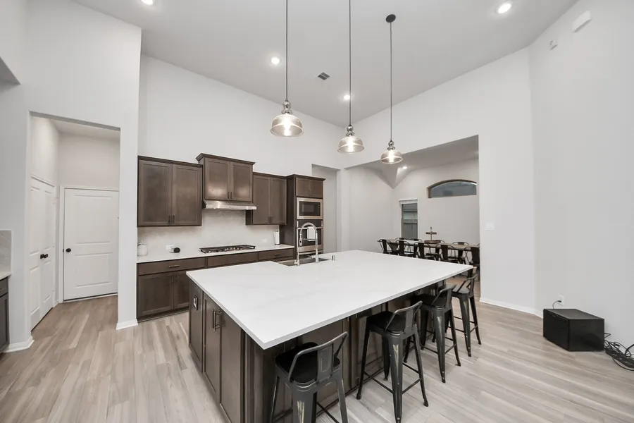 This gorgeous one-story home is not only spacious but sits on an oversized lot that’s perfect for a future pool or outdoor oasis. With 4 generously sized bedrooms, 4 full bathrooms, a dedicated study, and a game room, this home offers the perfect blend of functionality and luxury. You’ll be wowed by the soaring 14 foot ceilings in the living and kitchen areas, creating airy feel that’s hard to beat. The kitchen is truly a showstopper featuring Omega Stone countertops in all bathrooms and kitchen, a farmhouse sink, pull-out trash can, double ovens, large center island, herringbone backsplash, and an abundance of storage. You’ll also love the added water softener, reverse osmosis, and French drain. The tandem 3-car garage offers extra space for vehicles, storage, or even a workshop. Additional upgrades include built in surround sound, holiday light plugs along the exterior and no back neighbors. From the luxurious finishes to the smart, functional layout, this home checks every box.