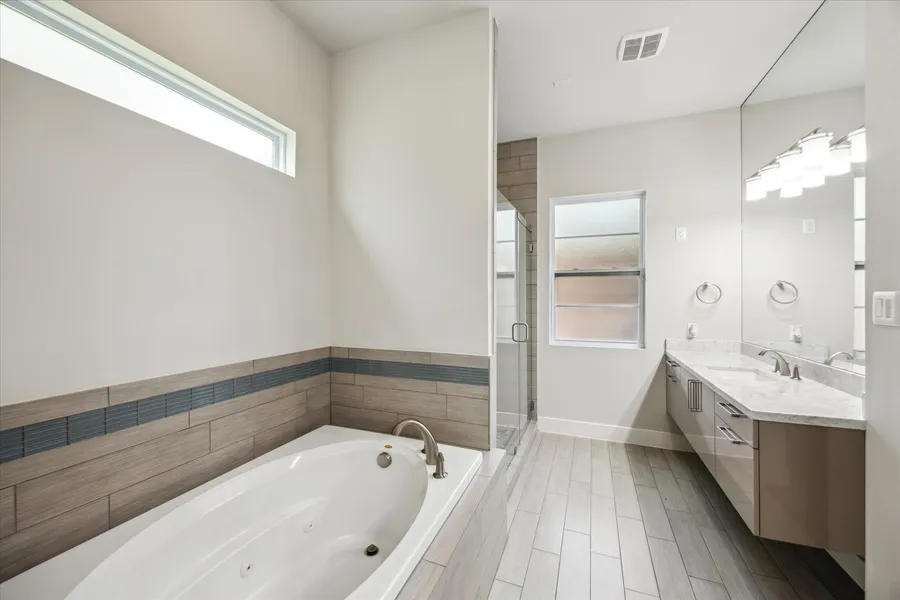 With clean geometric architecture , this home is fully fenced. Once through the patio entrance you are welcomed by a spa pool &lovely courtyard. The home has an open floor concept with sliding pocket doors to include the outdoor patios. The beautiful kitchen feature Miele appliances, Eggersman cabinetry, & a sweeping breakfast bar with marble countertops. Large first floor primary has a sumptuous en suite with jetted tub, large shower with rainfall showerhead & separate vanities. Upstairs there are two large en suite bedrooms with walk in closets, a laundry room &flex space which ...