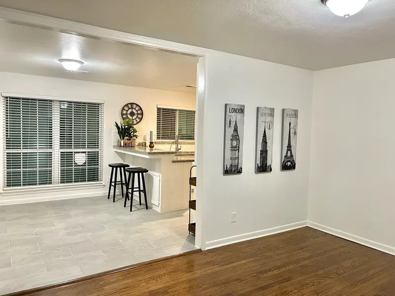 Beautifully updated home with standout curb appeal on a large corner lot! Inside, discover clear sight lines front to back, refinished real hardwood floors, and a freshly painted light & airy interior. The open layout offers seamless flow between the living, dining, and kitchen spaces. Large picture windows fill the space with natural light, and custom cabinets, granite countertops and a new range and dishwasher (on order) elevate the kitchen. The primary suite is conveniently located on the 1st floor; upstairs are 2 additional bedrooms, each with architectural detail, ceiling fans and dual windows. Enjoy entertaining in the expansive, low-maintenance backyard—fully fenced with no rear neighbors. Recent upgrades include a 2025 roof and A/C condenser, plus energy-efficient double-pane Low E windows throughout. A one-car attached garage and generous additional parking complete the package...