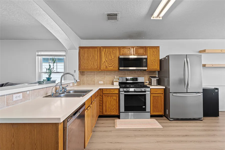 Charming and beautifully updated single-story home featuring 3 bedrooms and 2 full baths. Nestled against a peaceful ravine, the backyard offers added privacy perfect for relaxing on the patio or gathering around the fire pit with loved ones. Inside, the home showcases brand-new modern vinyl flooring throughout, recently installed solar panels, and new energy-efficient windows. A cozy corner gas log fireplace, updated fixtures, and a neutral color palette create a warm and inviting atmosphere. The kitchen is a chef’s delight, equipped with LG stainless steel appliances, a 5-burner gas cooktop, and plenty of space for both daily meals and entertaining