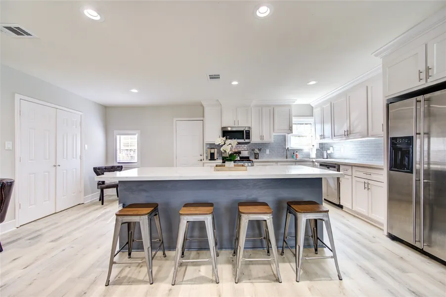 This move-in-ready home features an open floor plan with quartz countertops throughout, custom-built cabinets, and stainless steel appliances. Enjoy the comfort of a HVAC system, recessed lighting throughout, and brand-new carpet in the bedrooms.