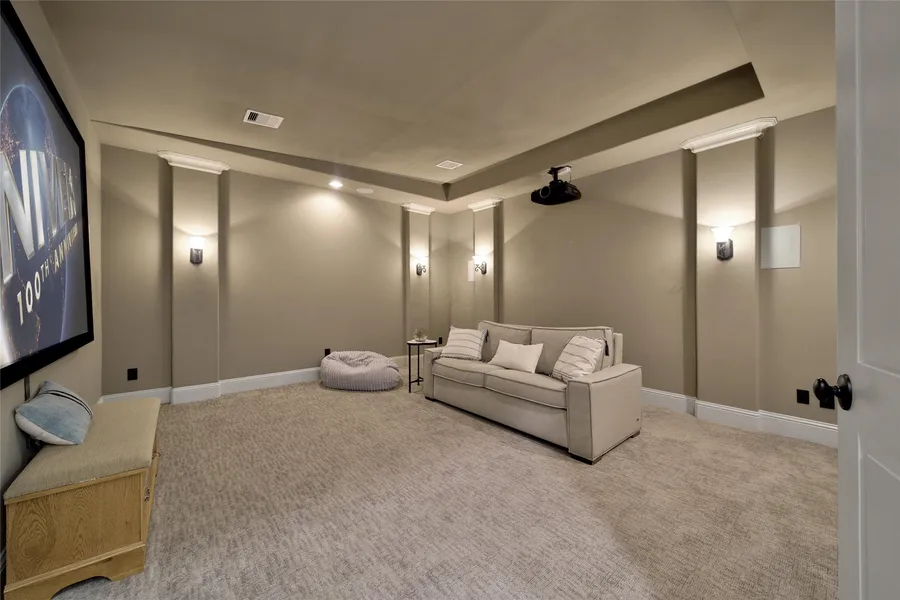 A private primary suite and second downstairs bedroom offer ideal accommodations for guests or multi -generational families, while the first floor-floor media room delivers a true cinematic escape! Recent upgrades include gorgeous wood flooring, plantation shutters, epoxy garage finish, water softener, and two Lennox variable -speed A/C units!