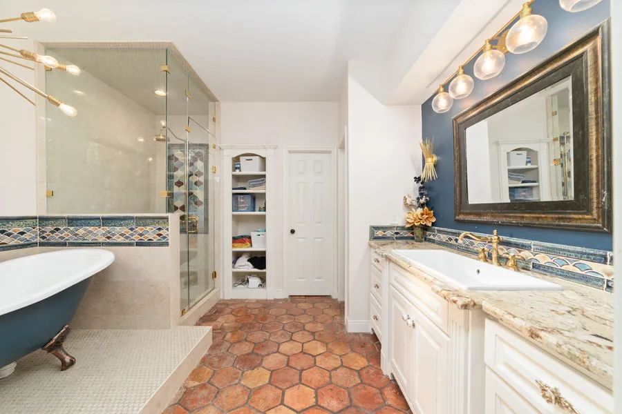 Fabulous custom built golf course lot home in Hearthstone! Enter the home to its elegant brick archways, dark wood floors & gorgeous vaulted beadboard ceilings. Granite countertops, island & stainless appliances in kitchen, primary bedroom down access to the backyard. Half bath located near family room & spacious den with full wet bar and window access to the pool area! Front turret room (dining) enhances this homes "castle-style" appearance. Spectacular backyard views of the golf course with covered patio, pool/spa & plenty of yard space for pets & kids to run. Check out the double fireplace between the family & den room along with your very own private fireplace in the primary bedroom. Complete primary bathroom remodel (2019) with stand alone claw tub, walk in shower, light fixtures, dual vanity & walk in closet. Roof & hardiplank replaced (2016) back patio added (2022) pool decking re...