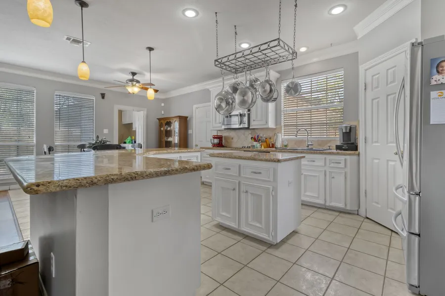 Large 1 story home on quiet cul-de-sac. 4 Bedroom/3 Bath/2 Car Detached Garage. Solid surface flooring throughout. French doors to study off entry. Large Island kitchen with granite counters and stainless appliances and open to family room. Formal Dining + Breakfast Room + Breakfast Bar. Large den with fireplace.