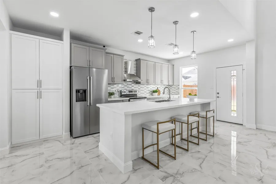 Welcome to this beautifully renovated 2 story home featuring 4 bedrooms and 2.5 baths, offering extensive UPGRADES and thoughtfully selected finishes throughout. The bright, open layout is enhanced by sleek tile flooring, fresh paint and abundant natural light. Completely updated gourmet kitchen boasts quartz counters, custom cabinetry, stainless steel appliances and huge island. Adjacent spaces include a dining room and stylish wet bar, creating an ideal setup for hosting family & friends. Inviting family room showcases 2 story ceilings, a contemporary electric fireplace and wall of windows. Primary suite offers a peaceful retreat w/spa-like bath w/dual-sink vanity and custom closet. Upstairs, you’ll find a spacious game room complete with custom built-ins & striking quartz accent wall. Laundry room provides washer & dryer (convey w/home). Upgrades include new roof (2025), lighting, car...