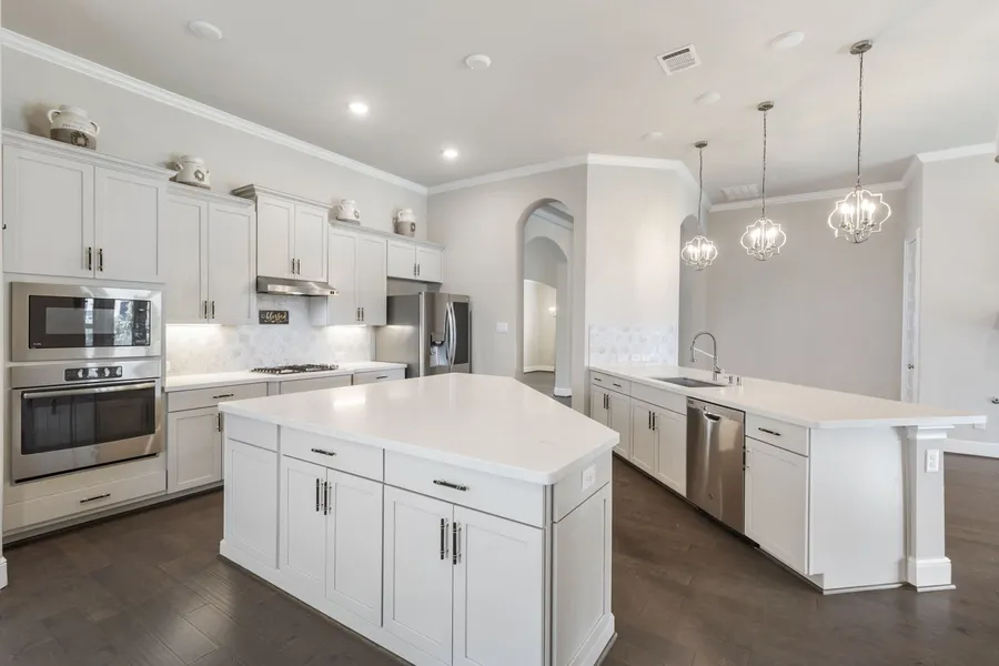 Enjoy the ease of one-story living with all main spaces conveniently located on the first floor. The fabulous kitchen is equipped with a large island offering abundant storage and counter space, as well as a peninsula perfect for additional seating. Stylish pendant lighting and designer hardware add a touch of elegance. The beautifully designed fireplace serves as the focal point of the family room, which connects to the covered back patio. The spacious primary suite is large enough to accommodate a comfortable sitting area. Three generous secondary bedrooms share two full bathrooms, while a formal dining room, private home office, and three-car garage with epoxy flooring complete the main level.