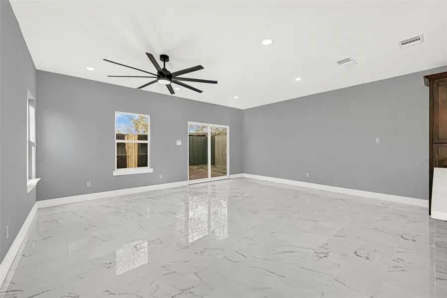 Newly constructed home features: three bedrooms and two and a half baths upstairs. Includes an upstairs balcony (5.4' x 17.7'), a fully fenced paver patio in the rear, a master bathroom with a double sink vanity and walk-in closet, a dual shower faucet, custom cabinets with soft-close doors, quartz countertops, double-pane low-E windows, tile floors on the first floor, and water-resistant luxury vinyl plank flooring on the second floor. Oversized garage door for taller vehicles. New St. Augustine grass and dimmers on interior lights.