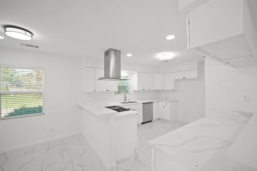 Fully remodeled in 2024, this stunning Forest West home blends modern design with thoughtful functionality. Featuring wide-plank flooring, fresh paint, recessed lighting, and a black brick fireplace as the focal point, the open-concept living area flows seamlessly into the kitchen with quartz countertops and a spacious passthrough bar. The dedicated study/flex room offers privacy behind French doors. The primary suite includes a stylish en-suite bath with a walk-in shower and dual vanities. Two secondary bedrooms mirror the home’s modern look and share a spacious bath with a large walk-in shower and separate vanity area. Outside, enjoy a fully fenced backyard with a stone patio—perfect for entertaining. A detached two-car garage includes an extended flex space ideal for a gym, studio, or workshop. Located on a corner lot in a quiet, established neighborhood with quick access to 290 and Loop 610.