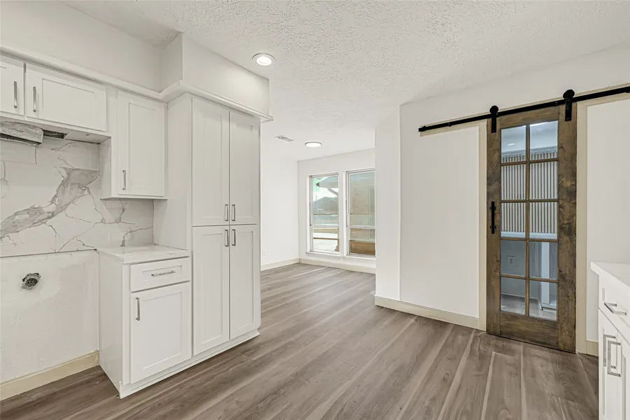 Beautifully updated single-story home featuring a bright, open-concept layout with luxury wood-look flooring and modern finishes throughout. The spacious living area offers recessed lighting, ceiling fans, and stylish sliding barn doors leading to a light-filled sunroom. The fully renovated kitchen boasts white shaker cabinets, quartz countertops, marble-look backsplash, stainless appliances, and ample storage. Bathrooms shine with designer tile, upgraded vanities, and a spa-style walk-in shower. Generous bedrooms include plush carpet and great natural light. Outside, enjoy a large fenced backyard with plenty of room to relax or entertain. Move-in ready with contemporary upgrades inside and out!