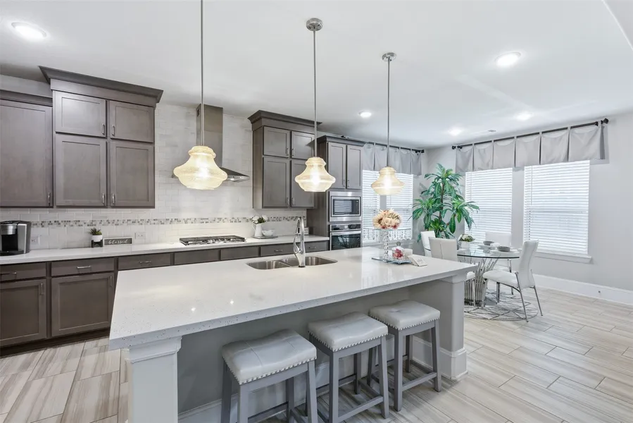 This two-story home in Waters Edge offers 4 bedrooms, 2.5 bathrooms, and an attached two-car garage. The open-concept layout features a spacious family room with a gas fireplace that flows into the kitchen and breakfast area. The kitchen includes quartz countertops, a large island with seating, stainless steel appliances, a gas cooktop, and ample cabinetry. A formal dining room and home office provide additional flexible living spaces. The first-floor primary suite features a tray ceiling and an ensuite bathroom with dual vanities, a soaking tub, a separate walk-in shower with a built-in sitting area, and a private toilet room. Upstairs includes secondary bedrooms, a game room, and a media room ideal for entertainment. The home also offers a dedicated laundry room, multiple storage closets, and energy-efficient features. A fenced backyard with a covered patio provides outdoor living spac...