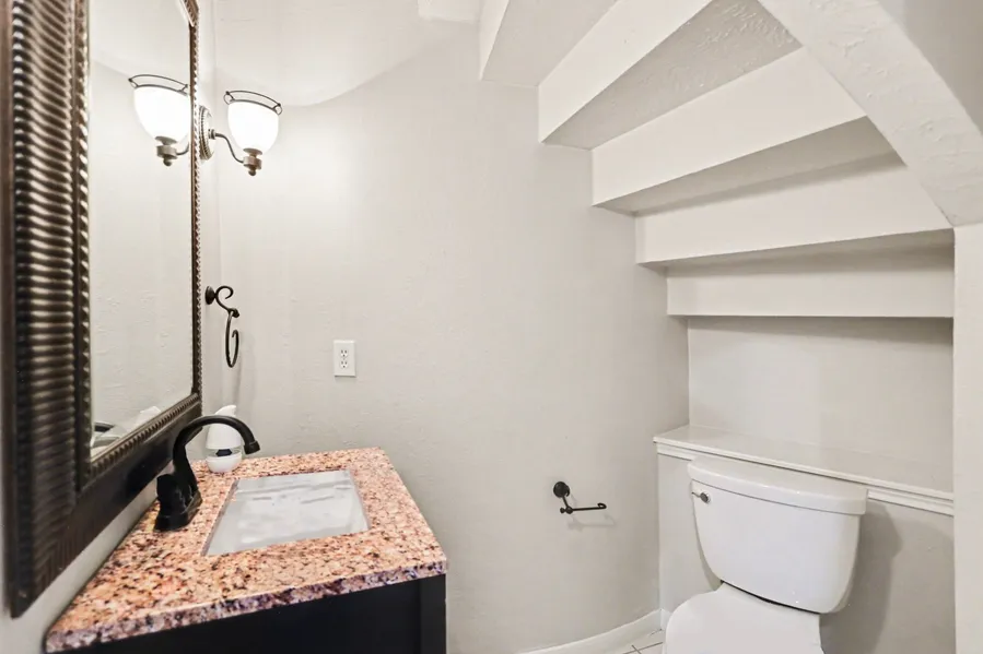 This home is filled with character that sets it apart from new construction. The main level offers a formal dining room and a front sitting room, which leads into a charming bar area, ideal for entertaining. The kitchen features updated granite countertops and white appliances, flowing seamlessly into a bright breakfast area and a spacious living room centered around a cozy fireplace. Large windows throughout the back of the home brighten the space with natural light.