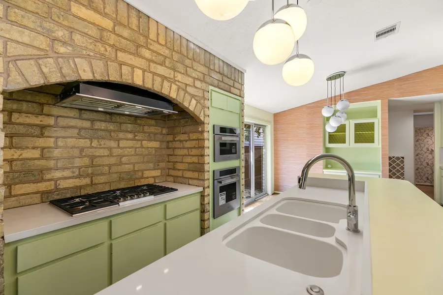 Tired of soulless "flipperized" updates that strip the character out of a house but don't want to take on the reno needed on most mid-century houses? The perfect impossible find! Attention lavished on every detail in both systems & cosmetics. Practically everything you could possibly do to a house is DONE but carefully keeping the mid-century modern vintage character. Circle drive & enter through elegant double doors into a giant swanky living area with soaring ceilings, moroccan inspired arch & round FP with sunken seating area. Walls of glass let in lots of natural light. Showstopper kitchen with very high end Fulgor Italian appliances, grasscloth, corian counters & cork flooring that extends into the sunny game room. Marimekko wallcoverings, skylights, primary bath with sunken poured terrazzo tub. Wood parquet floors, double doors to the 3rd bedroom or study. Glass walled sunroom, gu...
