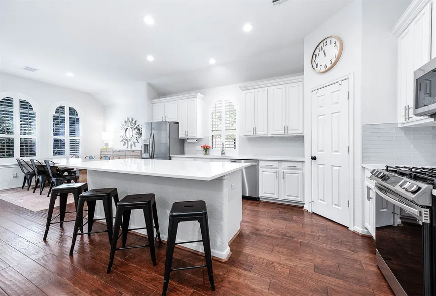 Exceptional updated home with private pool, located on a quiet cul-de-sac and zoned to top-rated Creekside Forest Elementary. Thoughtfully improved throughout, this 4-bedroom home features hardwood and tile flooring throughout (no carpet), plantation shutters, upgraded lighting, and a flexible layout with office and additional living space. The kitchen offers quartz countertops, painted cabinetry, and newer appliances, opening seamlessly to the main living area. The fully remodeled primary suite features a freestanding soaking tub, frameless glass shower, and modern finishes. Extensive recent upgrades include new HVAC system (2024), new pool pump (2024), new pool filter (2025), new pool motor capacitor (2023), interior and exterior paint, new fireplace surround, upgraded lighting and hardware, and energy-efficient window tint on rear and right side windows.
