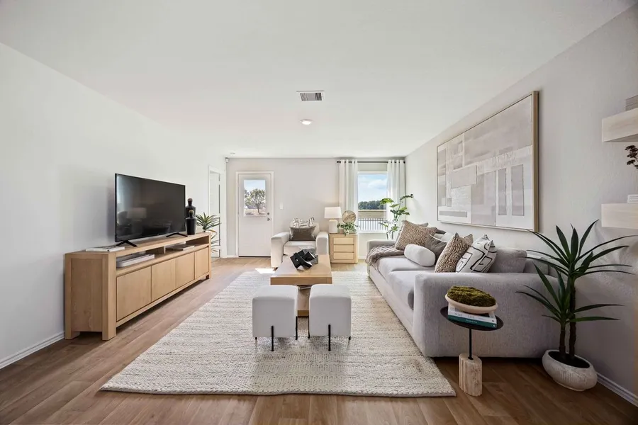 Discover the charm of the Emma floor plan, a thoughtfully designed single-story home featuring 4 bedrooms, 2 bathrooms, and a 2-car garage. Enter through the inviting front porch into a welcoming foyer, where a secondary bedroom is located at the front ideal for guests or a home office. A full secondary bathroom and utility room are conveniently nearby. Continue into the open-concept heart of the home, where the kitchen, dining room, and family room seamlessly connect. The kitchen boasts stainless steel appliances, a large island, and a spacious pantry, making it perfect for entertaining or casual family meals. At the rear of the home, the primary bedroom provides a peaceful retreat complete with a walk-in closet and a private bathroom featuring dual sinks and a large shower. Two additional secondary bedrooms are located nearby, offering plenty of space for family or guests.