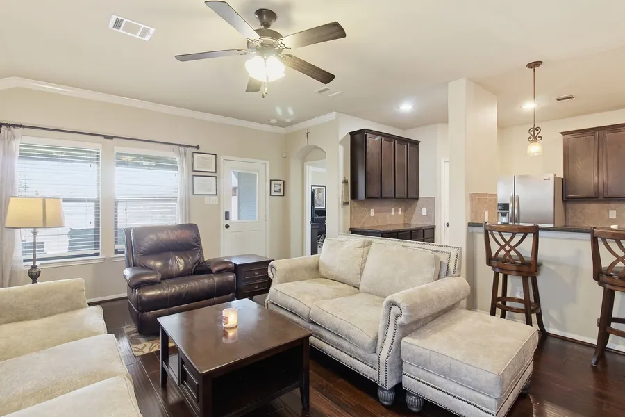 Enjoy outdoor living on the extended back patio complete with a ceiling fan and lighting — perfect for entertaining guests or unwinding after a long day.