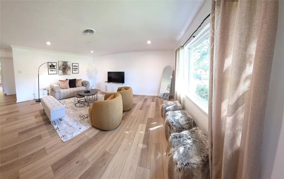 This renovated home boasts designer finishes throughout. The kitchen features quartz counters, 42" custom cabinets with crown molding, soft-closing drawers, under-cabinet lighting, stainless steel appliances, a built-in oven, separate cooktop, and a large stone sink. Updated LVP flooring is featured throughout, with porcelain tile in the bathrooms. Modern style lighting fixtures and added recessed lighting. The home also includes new Low-E double pane windows, a whole house re-pipe with PEX and new drain lines, recent/2023 40-gallon water heater, a new 5-ton Carrier A/C unit/ 2024, updated GE electrical panel with wiring throughout, and new outlets/switches. The foundation has been repaired and comes with a warranty.