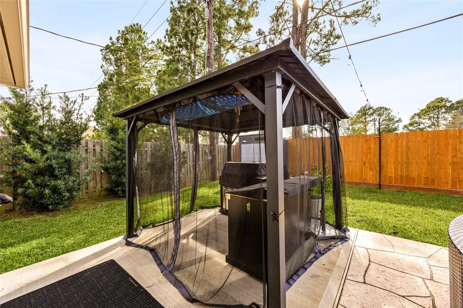 Outside, enjoy the covered patio, screened-in gazebo featuring an outdoor kitchen, and sparkling pool.