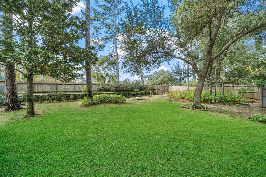 Impressive Huntwick Forest Home on beautifully landscaped homesite. New Roof just installed February 2026. Custom Home features 4 bedrooms with spacious master down. Storm windows/whole house re-piping (2016). Upon entry is a large formal living area and dining room which just beyond is the grand Family room with gas log fireplace and block paneling which extends through the breakfast room and kitchen with great views of the inviting backyard with impressive mature trees. Large master bedroom features separate vanities. Upstairs features 3 large bedrooms and a Jack & Jill bathroom with double sinks. Laundry room with broom closet and sink. Detached 2 car garage. Brick walkway leads to a separate attached workshop behind garage. Beautiful backyard with deck, spa and sitting area.