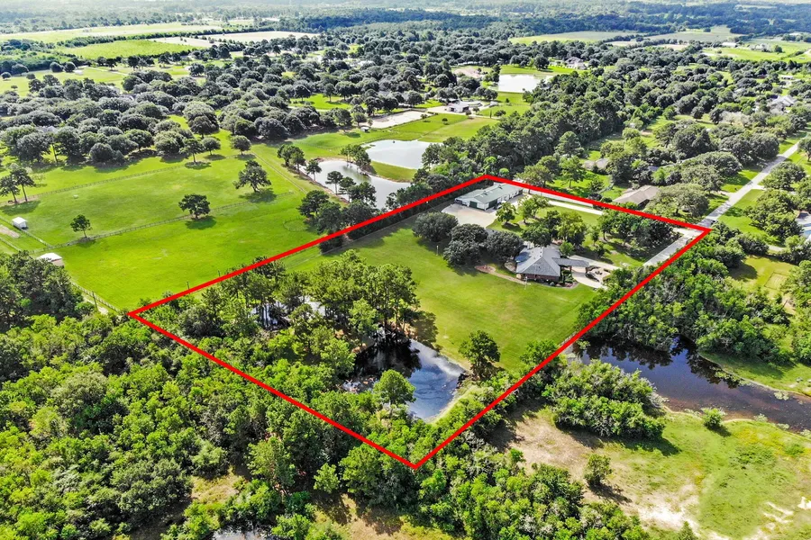 This expansive and secluded 4.86-acre compound includes an updated 3,072SF main residence and a 5,000SF barn/garage -once used to work on custom cars equipped with a full-auto shop, room for 10 vehicles or flexible space for horses and livestock plus a tractor-trailer, guest apartment, and an amazing entertainment lounge with full bar. In the 3BD/2.5BA residence, enjoy a large open plan living and dining alongside a fireplace and walk-up bar. The open kitchen features great storage and counter space. Enjoy two secondary suites plus an owner's suite with two walk-in closets & spa bathroom. Above the home's four-car garage, a 1,600SF home office/studio/apartment features a kitchenette & bath. Outside, covered patio welcomes outdoor entertaining. The sprawling property greets you with a double-gated circular drive, lush lawns, and mature trees. The grounds also offers a large lake for swimming and stocked for fishing. Plenty of room for a pool, sports court, & more. Close to 290 and 99.