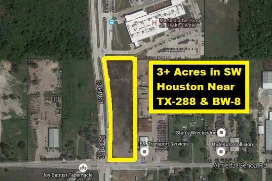 3.36 Acre Traffic Light Hard Corner at Scott & Almeda Genoa in Medical Center South Area Near TX-288 & BW-8. Inside Houston City Limits. Outside 610 Loop! Not in Flood Plain! All City Utilities. Minutes to Houston Downtown, TX Medical Center, Hobby Airport, NRG Stadium, Houston Toyota Center, George R Brown Convention Center, Houston Museum District & Pearland Town Center. Great location for Church, Warehouse/Storage, Car Dealership, Retail Strip Center, Gas Station/C-Store, Truck Parking Lot, Hotel, Distribution Center, Supermarket, or Commercial Business w/Billboard.
